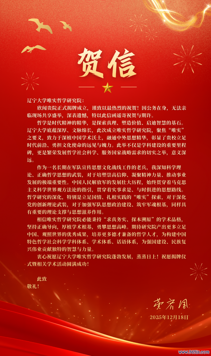 中国东说念主民镇定军电视宣传中心原总监、北京大学客座教育黄皆国同道因公未能亲临唯实玄学商榷院揭牌庆典,特致贺信:道贺商榷院揭牌,赞辽大以“唯实”为要深耕学术、融通中外,称此举是学科栽植里程碑与事业国度政策的求实之举。当作军队宣传阵线老兵,他强调“唯实”玄学对强化表面武装、助力军队念念政栽植的价值,欲望商榷院秉抓求真品格,产出驻足中国的为止,为学科体系构建与强国是业献力。